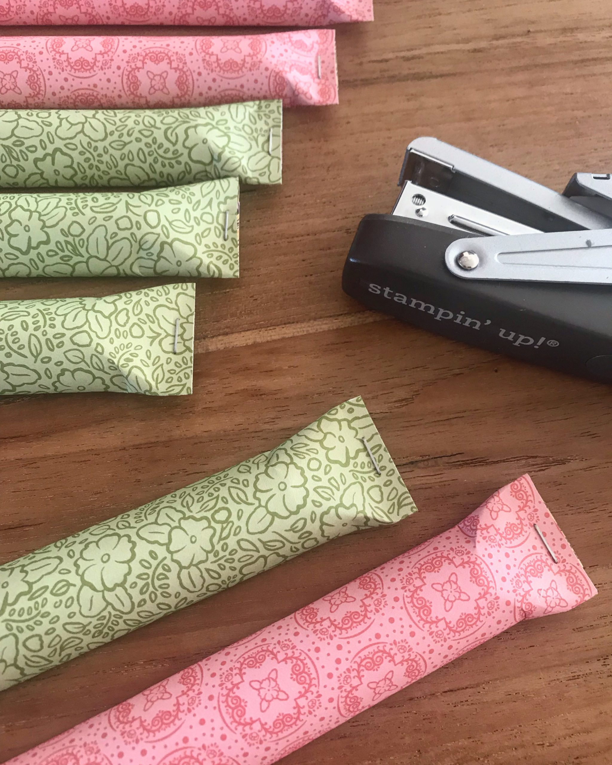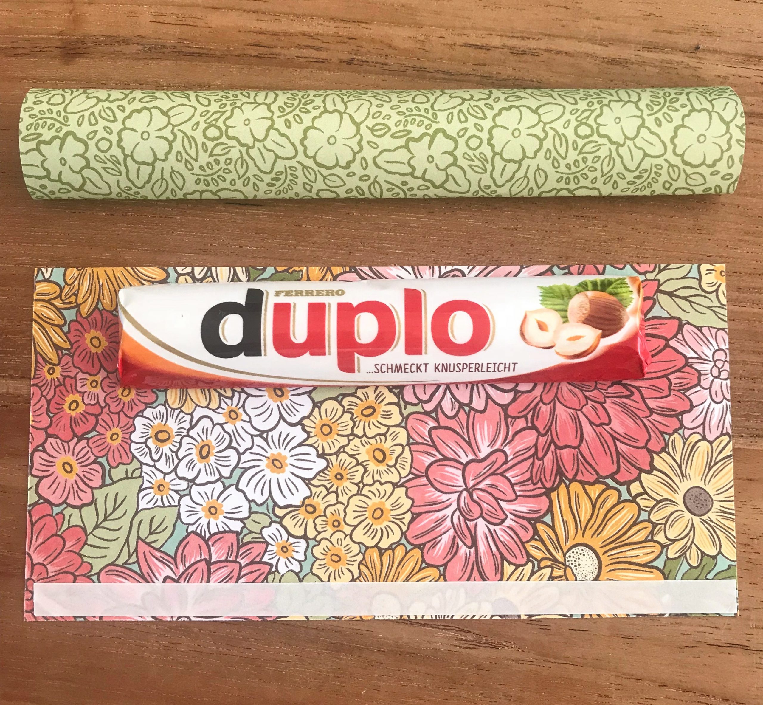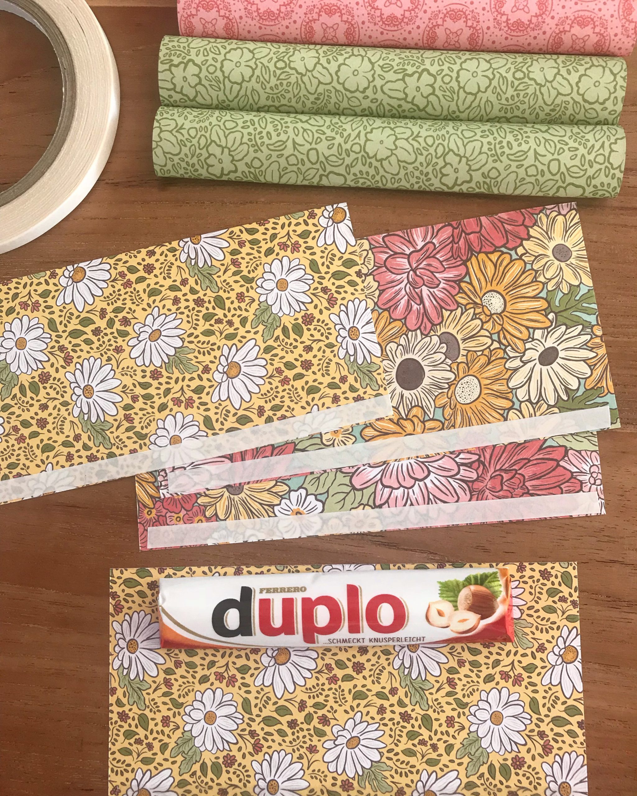 Schneide ein schönes Designpapier auf 3 x 6 inch zu und klebe an einer langen Seite ein doppelseitiges Klebeband auf. Ziehe die Folie ab und wickel „die längste Praline der Welt“ einfach mit dem Designpapier ein. Ich finde es am Einfachsten, wenn Du die Praline wie auf dem Bild bündig anlegst und diese dann mit dem Designpapier nach unten rollst, dank des Zuschnitts auf 3 inch passt es perfekt und du kannst den Klebestreifen auf der glatten Unterseite festdrücken. Die Enden rechts und links tackere ich einfach zu, so entsteht eine schöne Form und es ist super easy und schnell gemacht. Es braucht nicht immer viel Zeit um schöne Goodies zu zaubern. 😉