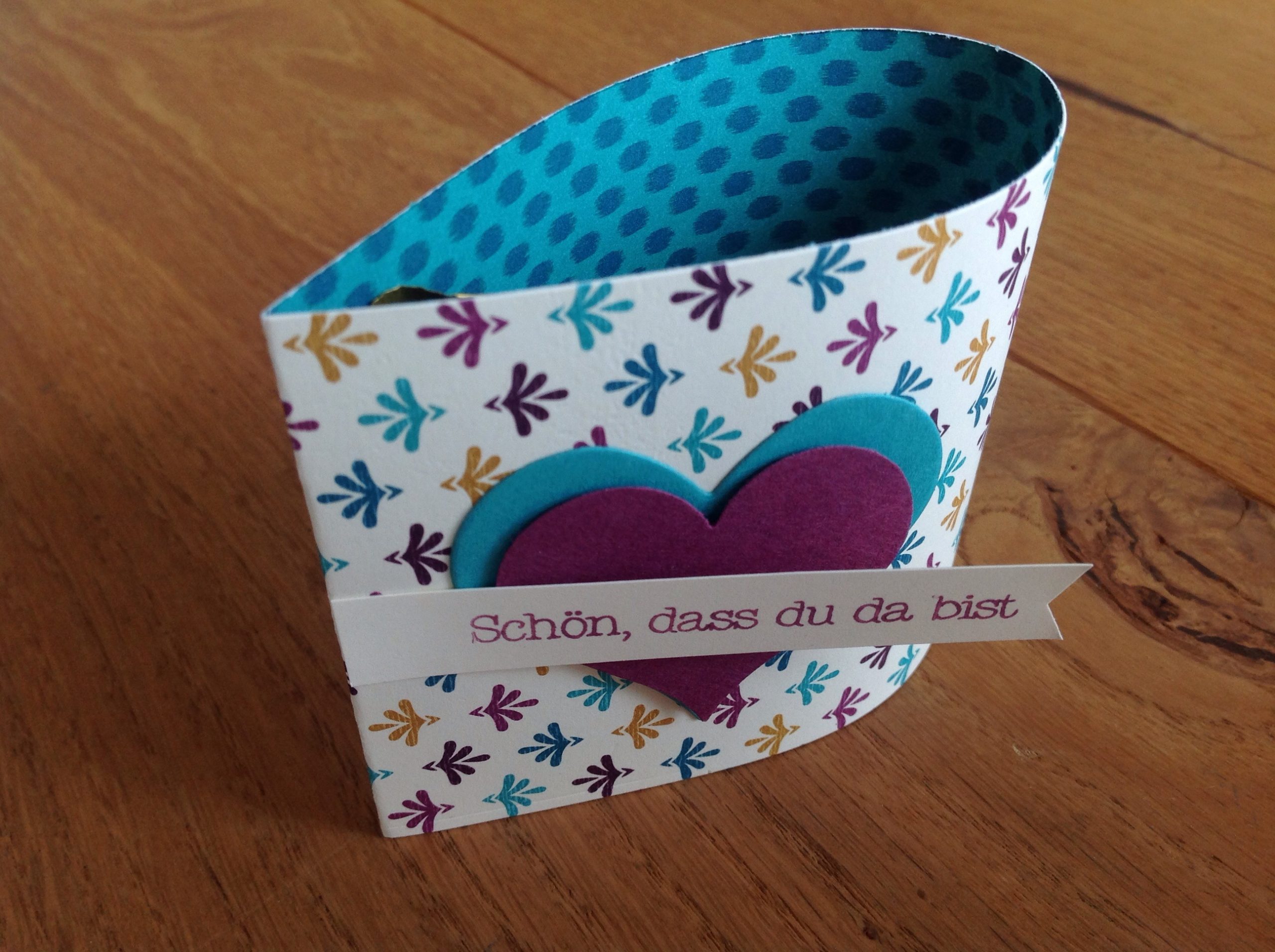 Mit dem tollen craftpapier kombiniert wirkt es Designpapier Bohème richtig „schlicht“. Für etwas Farbe habe ich dann wieder einmal zwei Herzchen in meinen Lieblingsfarben mit untergebracht 😉. Da das craftpapier dicker als das Designpapier ist, knickt es leichter, hier ist etwas Fingerspitzengefühl gefragt; dennoch finde ich diese Goodies ebenfalls gelungen und meine Kunden haben sich auch gefreut 😅 (und das ist schließlich die Hauptsache!)