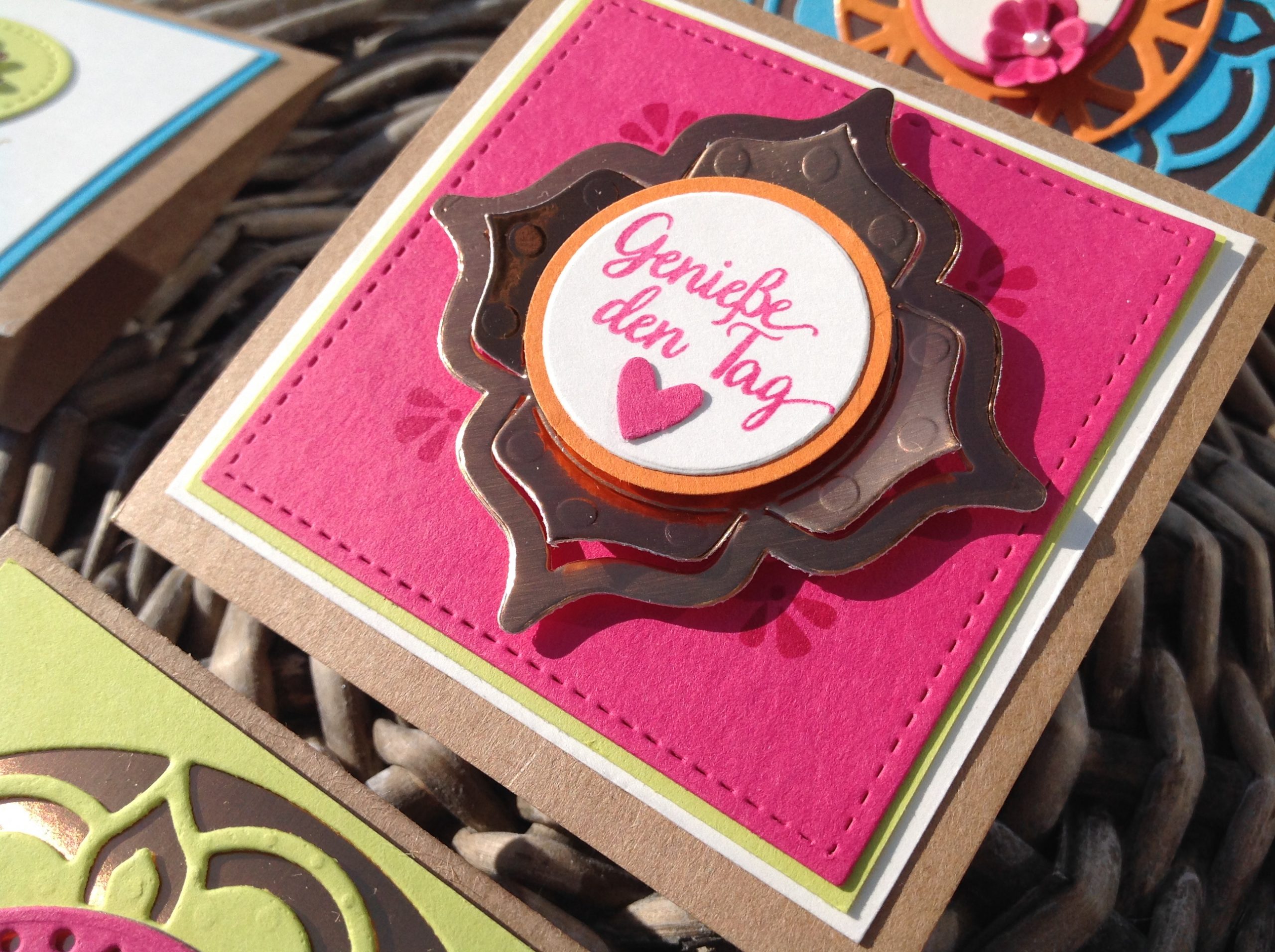 Der Mix aus knalligen Farben mit Craftkarton und Kupferfolie macht doch richtig Lust auf Sommer, oder? Hier nochmal alle Karten im Detail: