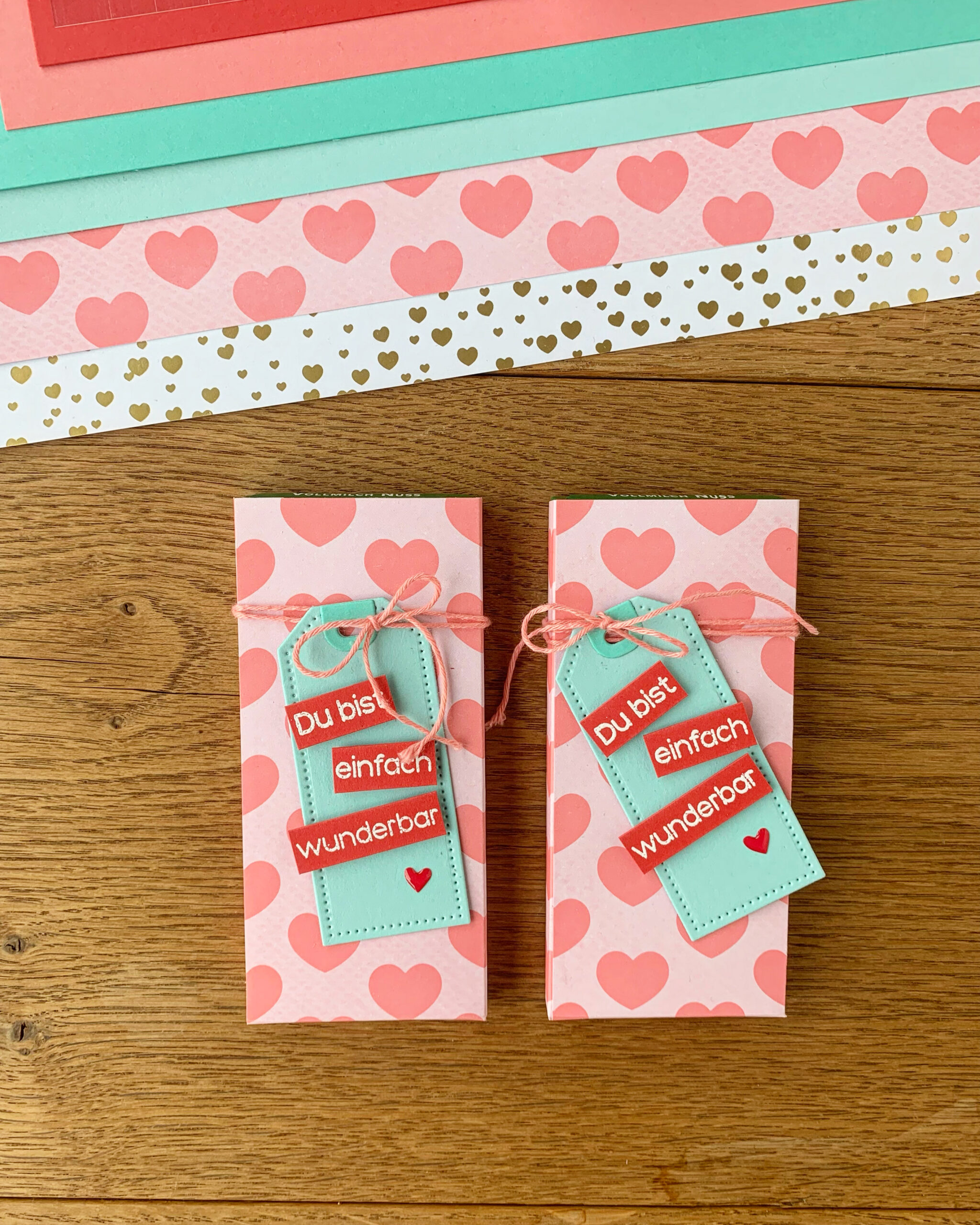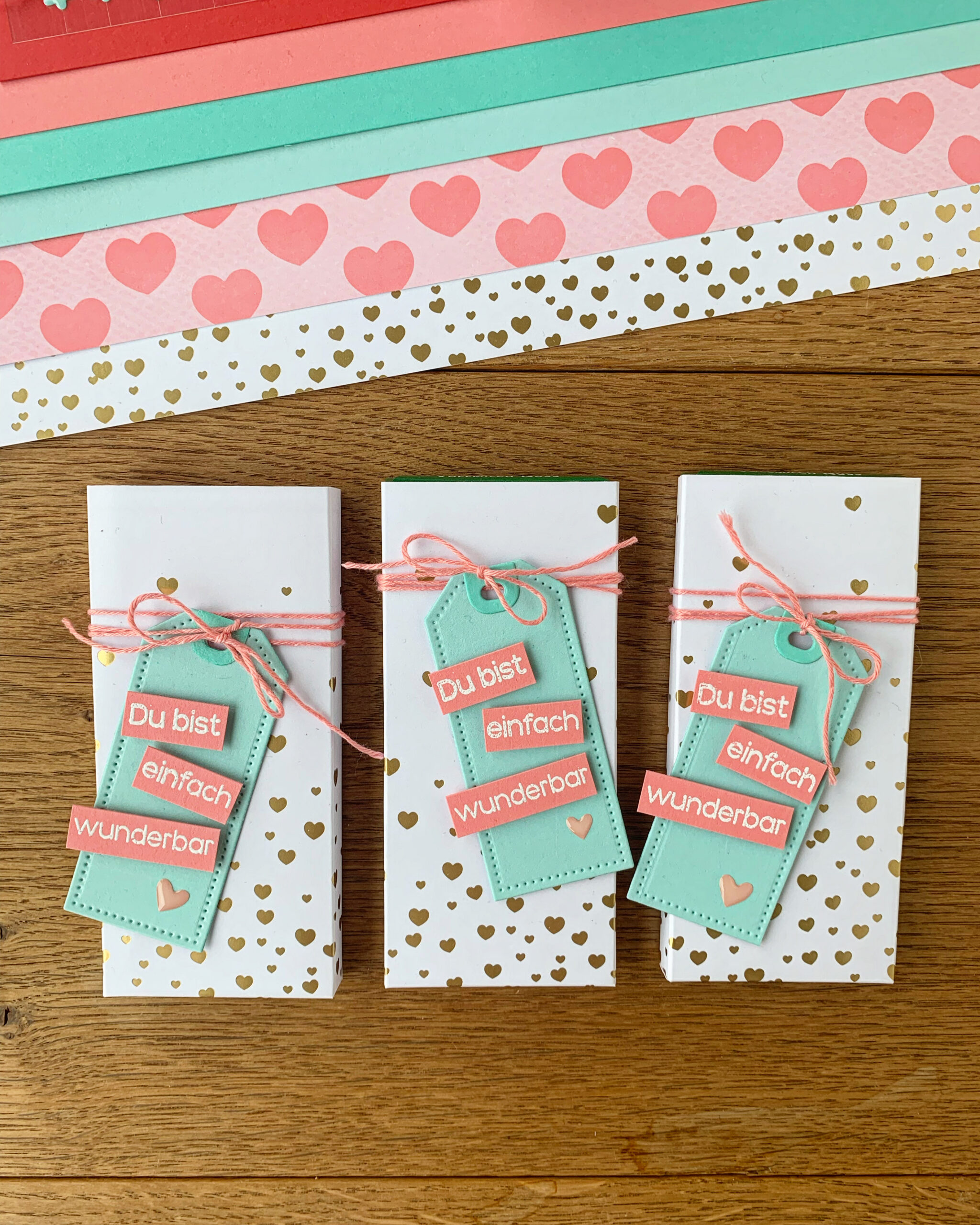 Ich habe mir 2 Designpapiere aus dem Set „goldige Muster“ ausgewählt und daraus kleine Verpackungen gestaltet, angepasst auf die Schokoriegel, die ich im Supermarkt gekauft habe.