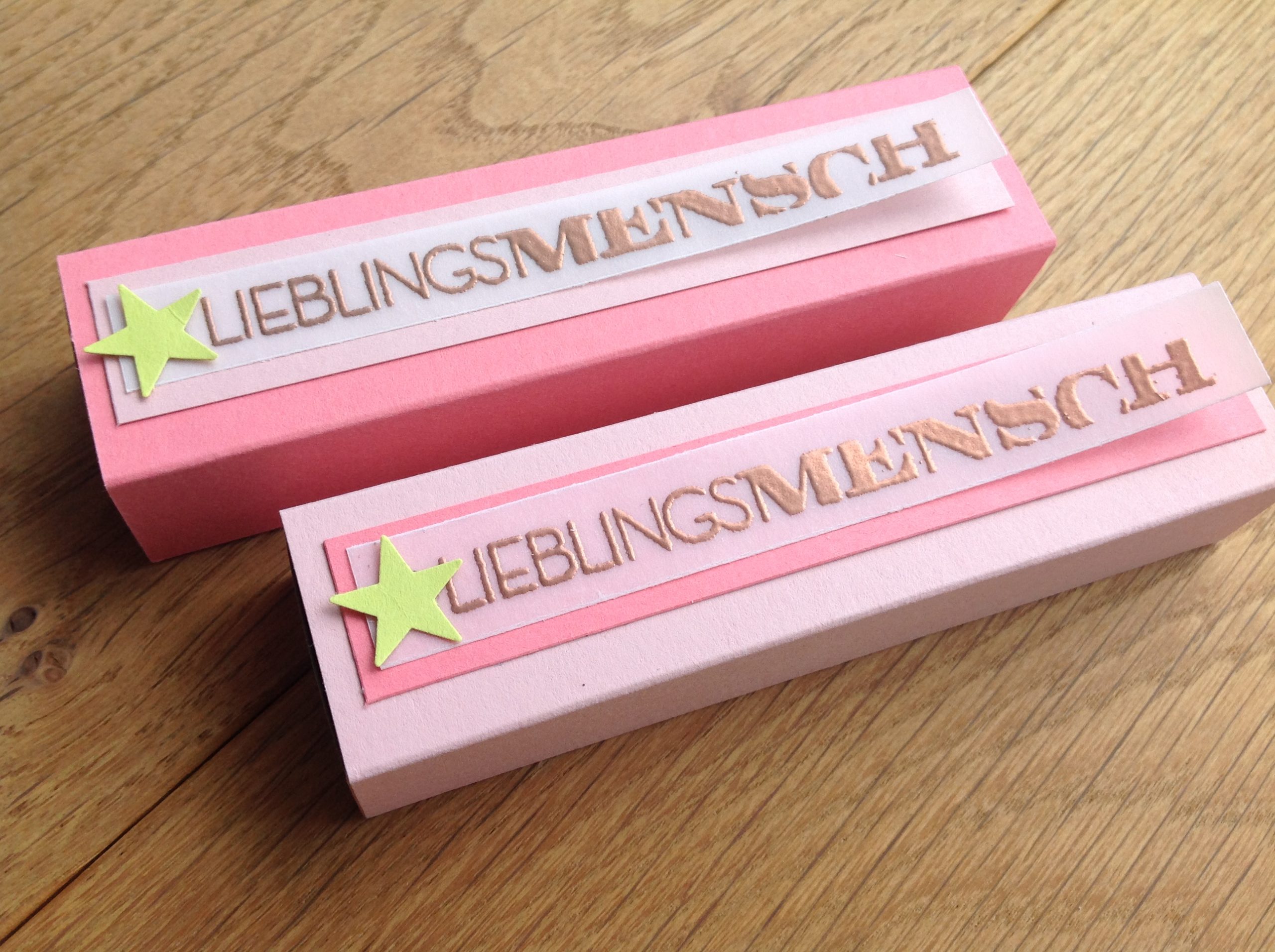 für meine Schwester habe ich eine kleine Auftragsarbeit gemacht, sie wollte ihren Gästen eine kleine Überraschung bereiten! Für die Mädels wünschte Sie sich Lieblingsmenschboxen für die Jungs sollte es die kleine Box-Version sein. Die Anleitung findet ihr *hier*